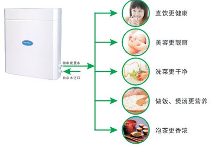 國際最先進處理技術(shù),全進口純天然濾材(從自然生態(tài)中提練,不添加化學穩(wěn)定成份),過濾精度0.01微米對自來水進行深度凈化,礦化、活化、離子化、新鮮化、富氧化、能量化、均衡化、能安全有效去除水中的泥沙,鐵銹余氯微生物、有機物、重金屬離子(如:鋁、汞、錳、鉻等)細菌等有害物;調(diào)節(jié)水的PH值(呈弱堿性)釋放天然有益的礦物質(zhì)微量元素,微小水分子團,滲透力強更易吸收、口感純正新鮮、媲美礦泉、美容保健、調(diào)理身體平衡、有益身體健康可直接生飲純凈水機健康能量水。