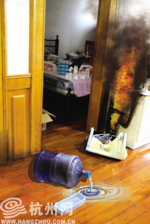 好在段姑娘冷靜,見(jiàn)飲水機(jī)電源線還插在插座上,一點(diǎn)沒(méi)燒壞,馬上跑過(guò)去拔下來(lái),接著拿起廚房里的塑料水桶,接了三桶水,總算把火撲滅了。