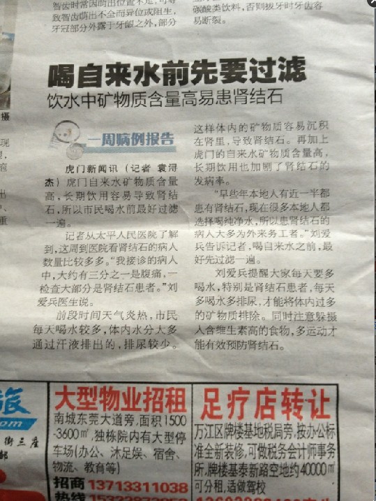 “早些年本地人有近一半都患有腎結(jié)石,現(xiàn)在很多本地人都選擇喝純凈水,所以患腎結(jié)石的病人多為外來(lái)務(wù)工者?!眲?ài)兵醫(yī)生告訴記者,喝自來(lái)水之前最好先過(guò)濾一遍。