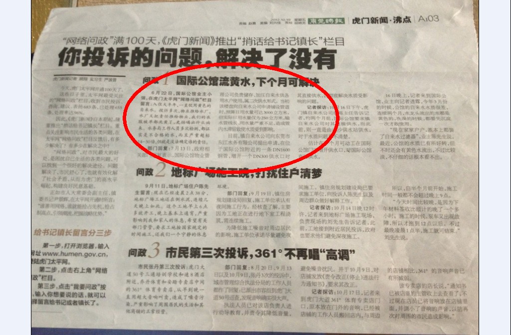 6月22日,國(guó)際公館業(yè)主小強(qiáng),在虎門(mén)太平網(wǎng)“網(wǎng)絡(luò)問(wèn)政“欄目留言:入住大半年了一直飲用黃色的自來(lái)水。投訴多次物業(yè)推給水廠,水廠又把責(zé)任推給物業(yè),我們的衣服床單都洗黃了,更怕喝出什么病來(lái)。水務(wù)局工作人員多次檢測(cè),都證實(shí)是不合格的水,而且嚴(yán)重超標(biāo)14-30倍,但就是沒(méi)法確定誰(shuí)的責(zé)任。